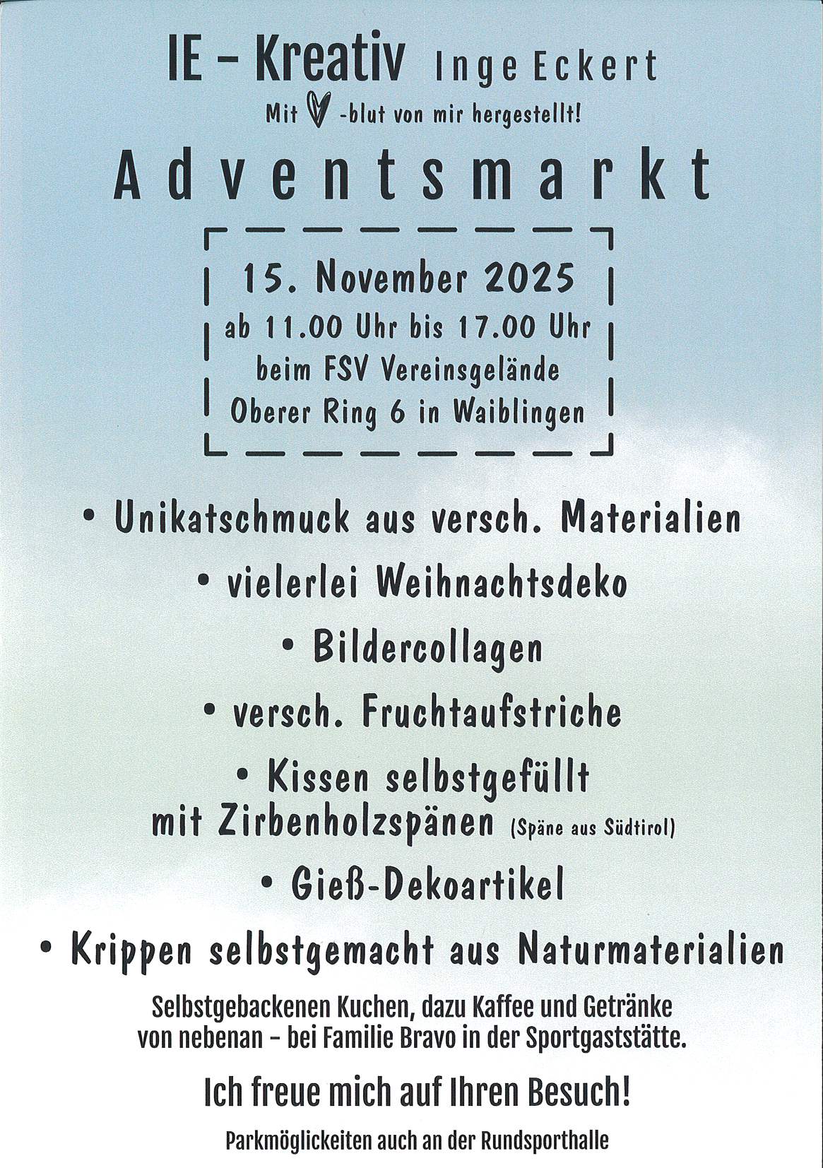Wo Handarbeit Herzen wärmt – Kreativ-Adventsmarkt von Inge Eckert Wenn der Duft von frisch gebackenem Kuchen und Kaffee durch den Gymnastikraum des FSV Waiblingen zieht, dann ist wieder Zeit für den Kreativ-Adventsmarkt von Inge Eckert. Am Samstag, 15. November 2025, öffnet die beliebte Veranstaltung von 11 bis 17 Uhr ihre Türen in der Gymnastikhalle am Oberen Ring 6.Mit viel Liebe zum Detail präsentiert Inge Eckert eine Fülle an handgemachten Schätzen: Unikatschmuck, Weihnachtsdekoration, Bildercollagen, Fruchtaufstriche, Krippen aus Naturmaterialien und viele weitere originelle Geschenkideen – alles aus eigener Fertigung.Bei einer Tasse Kaffee und einem Stück hausgemachtem Kuchen lässt sich in aller Ruhe stöbern, plaudern und die gemütliche Adventsstimmung genießen.Parkplätze finden Besucherinnen und Besucher auch an der Rundsporthalle Waiblingen.Ein Markt voller Kreativität, Herzlichkeit und Vorfreude auf die schönste Zeit des Jahres – ein Besuch lohnt sich!